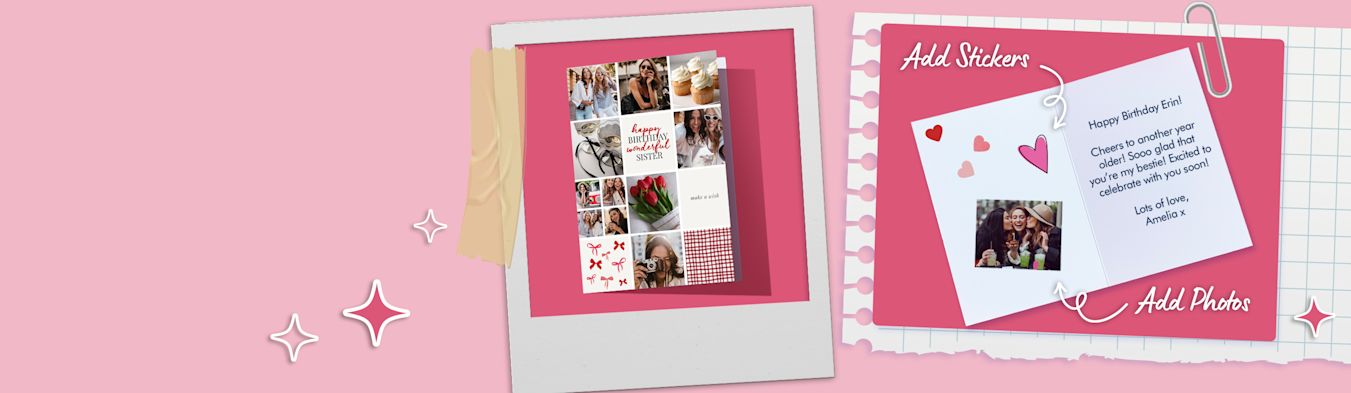 It’s now even easier than before to create a personal photo card. With our clever collage designer tool, you can quickly upload any photos you’d like from your desktop files or mobile phone gallery. They’ll then be intuitively made into a perfectly personalised collage card that your lucky recipient will love. Great for every occasion from birthdays to anniversaries, our customisable collage cards help you make every moment that little bit more special.